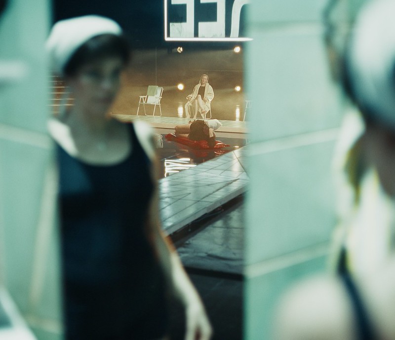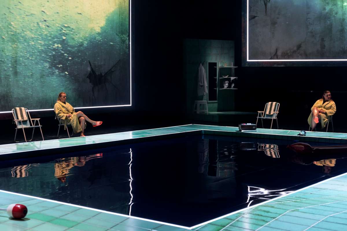 Näyttämön keskellä on suuri sininen vedetön uima-allas. Sitä ympäröi altaan kolmella sivulla kolme suurta, katosta roikkuvaa valkokangasta, joille heijastetaan videota. Uima-altaan sisä- ja ulkoreunaa sekä jokaista valkokangasta kiertää LED-valonauha. Näyttämön molemmissa takakulmissa on uima-altaan suihkukoppi, joissa on vaatekoukut, peruukkitelineet ja peilit. Näyttämöllä Peter-delfiiniä edustaa suuri musta kaiutin.
